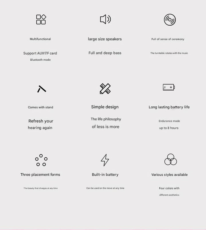 Experience a warm and cozy audio journey with this Retro Phonograph Style Bluetooth Speaker. This beautifully designed speaker embodies a "less is more" philosophy with its simple, light, and fresh aesthetic. It features a unique rotating disc that visually spins with the music, adding a captivating, ceremonial feel to your listening experience. Equipped with Bluetooth 5.3 for stable, original sound transmission up to 10 meters, it also supports AUX and TF card playback, breaking device boundaries. Enjoy rich, full-bodied sound from its large-caliber speaker, delivering satisfying bass. The built-in 1200mAh battery offers long-lasting companionship, providing up to 8 hours of continuous music from dawn till dusk. With three playback modes and multiple finish options, it��s not just the volume that rotates, but a whole interactive musical experience.